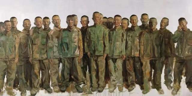 显然,周武发在他的一系列军事题材的作品里并没有图说事件、情节、主题,而是从形象塑造的本体出发,让形象的真实生动替代情节性的描述。他的关注点在于捕捉那些形象本身在随机与偶然中直呈出来的生命本真状态。他获得第十一届全国美展获奖提名的《71770部队特种兵大队新兵张小勇、姜浩、王二等》,仅从名字或许就能读到画家追求的某种随机性与偶然性,去掉“设计”其实正是这件作品获得成功的关键。画面一溜排开刚理完发、换上新军服的新兵蛋子的“憨傻样”,在那一刻显现出某种生动的淳朴——军装